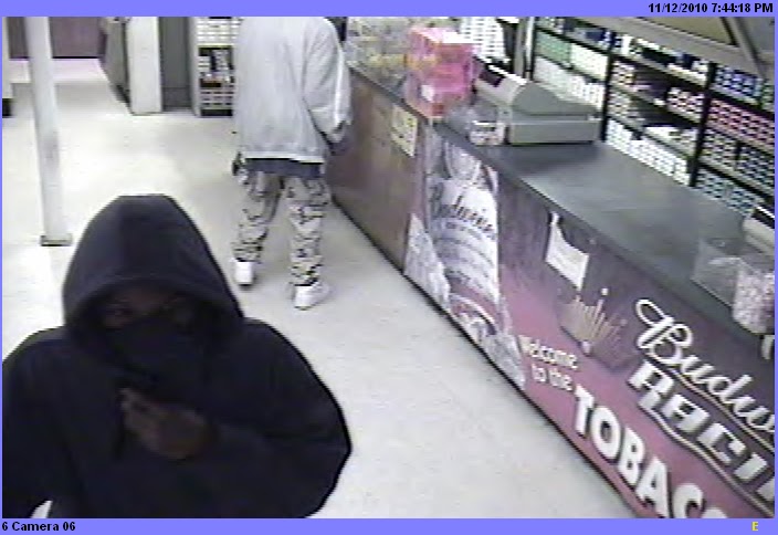 According to the police report, three black males (pictured right), wearing ski masks and hooded sweatshirts, entered the store at approximatley 7:51 pm last Friday. One of the suspects was carrying a firearm and pointed it at the store clerk while the other suspects took cigarettes and money from the cash register. The three suspects left the store with four cartons of cigarettes and an undetermined amount of cash.